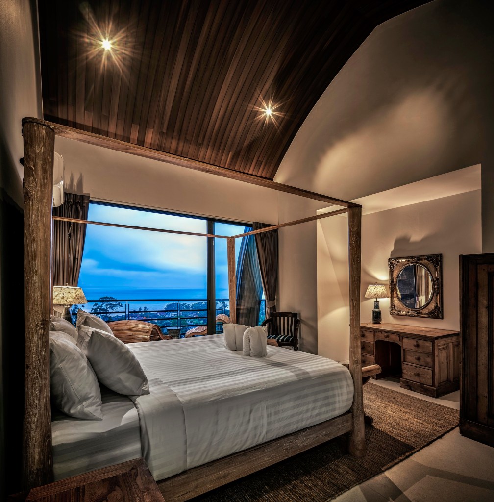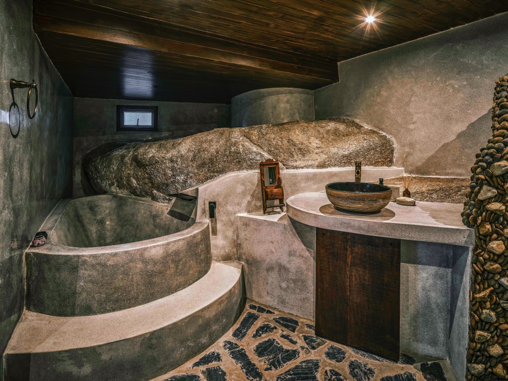 A sixth bedroom (the Suite), ‘Juniper and Sage’, is self-contained from the rest of the villa, with its own secret bamboo garden and outdoor rock jacuzzi pool. This is mostly reserved as our family quarter but is sometimes available as a sixth guest room. It has a breath-taking rock-cave bathroom with a shower made of local river pebbles, a spiral staircase linking it to a private BBQ terrace with a Bali-style rope seat hanging from antique Thai teak pillars.