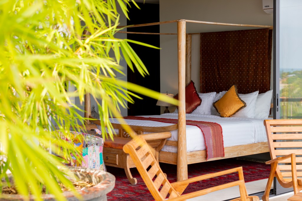 Bedroom 2: ‘Sumac and Clove’is inspired by the Turkish Bosporus, a narrow strip of waterway on the ancient Silk Road, linking the Mediterranean to the Black Sea. The four-poster bed in this room is decorated by a traditional vibrant red flat-woven Turkish Kilim fabric.
